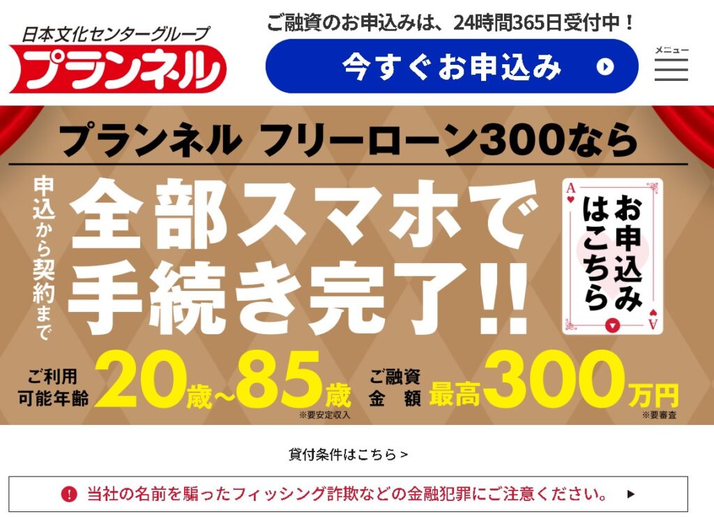 プランネル フリーローン300は、日本文化センターグループが展開しているキャッシングサービスです。融資金額は最大10万円~300万円となっており、利用に担保や保証人は不要です。