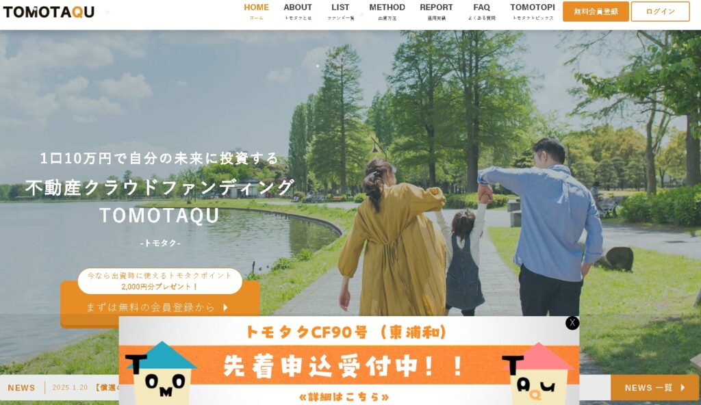 TOMOTAQU(トモタク)は、1口10万円からの投資が可能なクラウドファンディングサービスです。10年以上不動産投資事業をしてきた、実績豊富な事業者が選んだ物件が揃っている点が特徴です。
