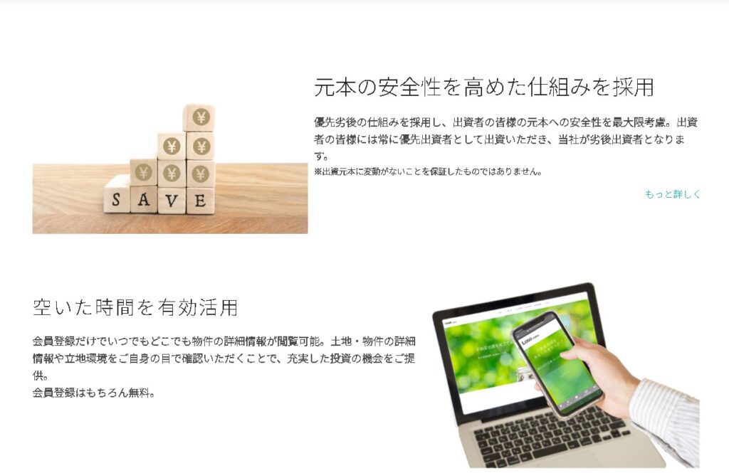 不動産のプロが運営するサービスだからこその可能性追求をコンセプトとしており、プロが厳選した物件を投資の対象としています。優先劣後システムを採用しており、安全性の高い投資が可能です。
