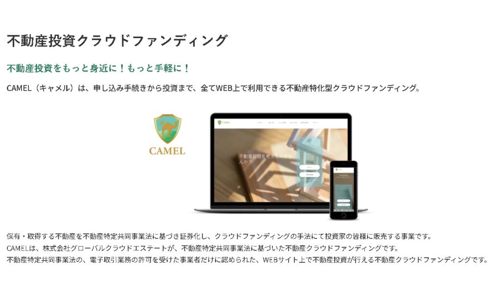 CAMEL(キャメル)は、海外不動産投資に活用できるクラウドファンディングサービスです。優先劣後システムを導入しており、ユーザーが安全性の高い投資ができるよう考慮しています。
