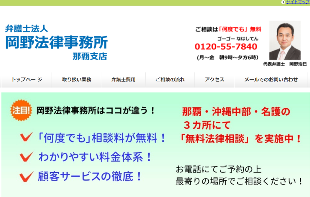 岡野法律事務所![]() | 弁護士法人 ★★ 弁護士多数在籍 | ★★ 相談無料 着手金あり | 那覇市、沖縄市、 名護市 |