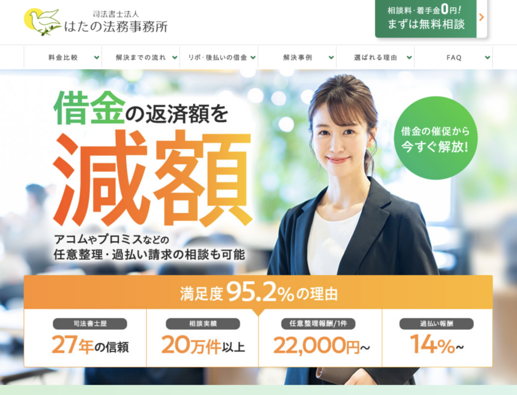 27年以上の歴史を持つはたの法務事務所は、これまでに20万件以上の債務整理相談を受けてきた実績があります。具体的な解決事例も多く、安心して任せられる事務所です。