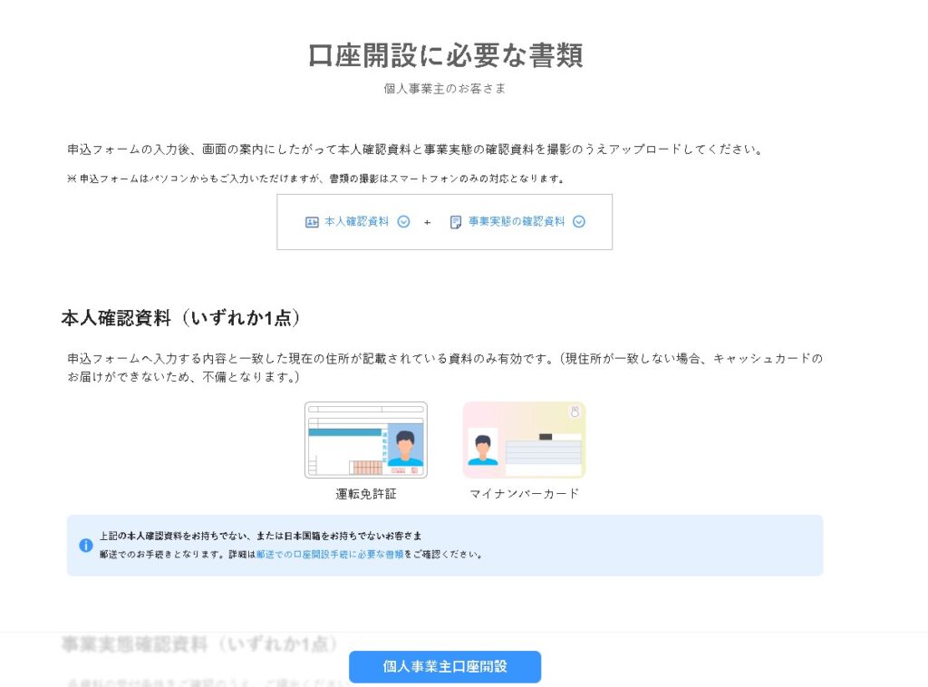 提出する確認書類は運転免許証とマイナンバーカード、事業の実態を確認できる資料(個人事業の開業等届出など)です。スマホで書類を撮影し、写真をアップロードすることで書類を提出できるので、スムーズに手続きを進められます。